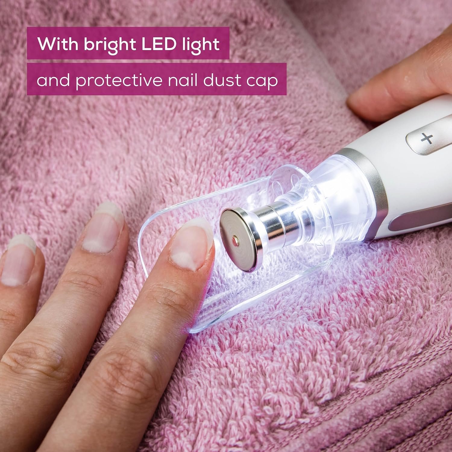 - LED-Guided Operation: Built-in LED light offers precise illumination for finishing details and optimal results with every portable nail file session.